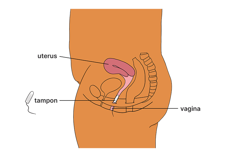 Tampons are absorbent ‘plugs’ that you insert in your vagina to absorb your period blood. They come in different sizes and are made of cotton or a combination of cotton and a synthetic material.